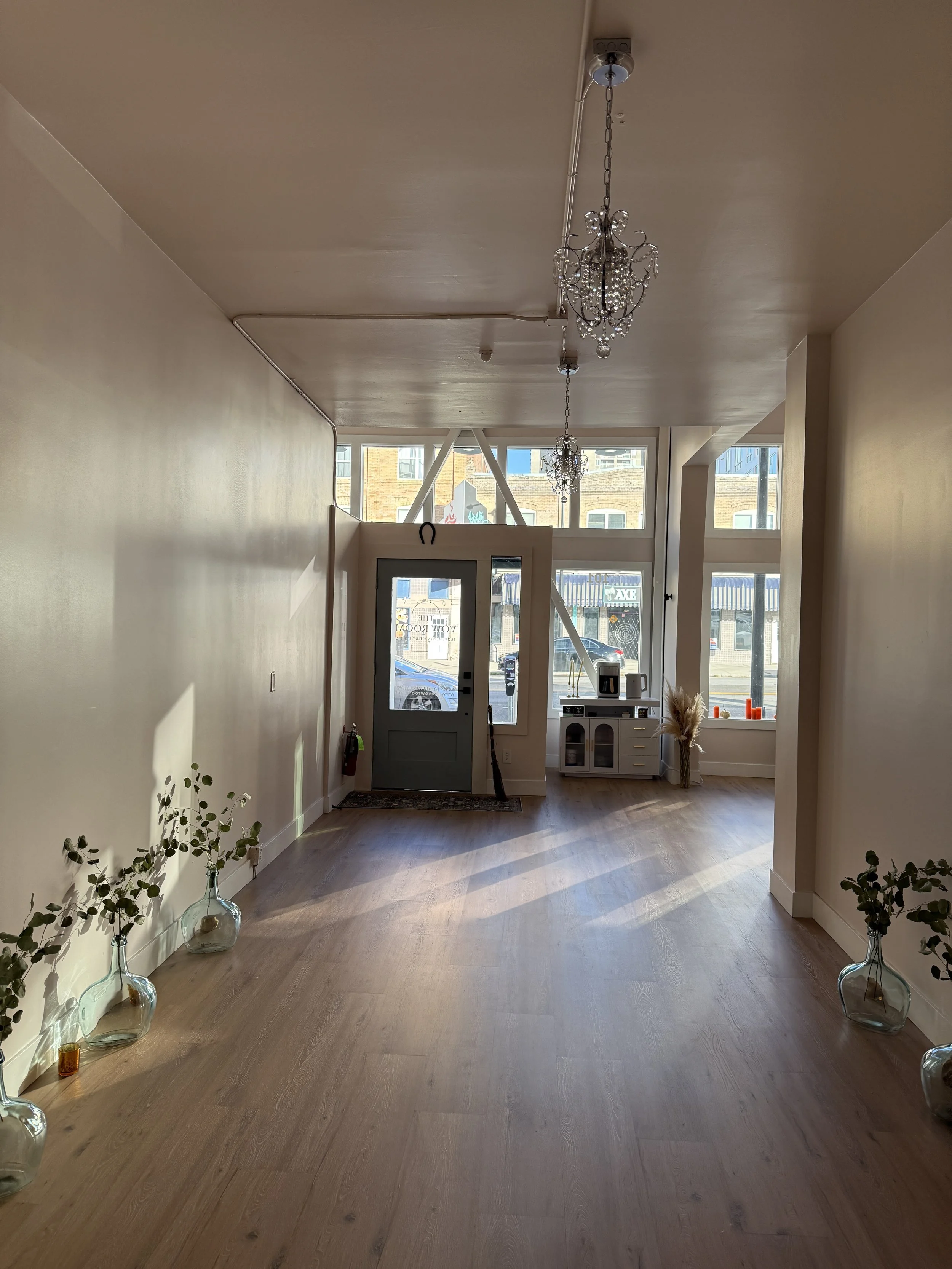 Private access to The Vow Room, ambient décor + lighting, coffee & tea station, music, and clean up. (Perfect for small celebrations, announcements, and intimate toasts.)